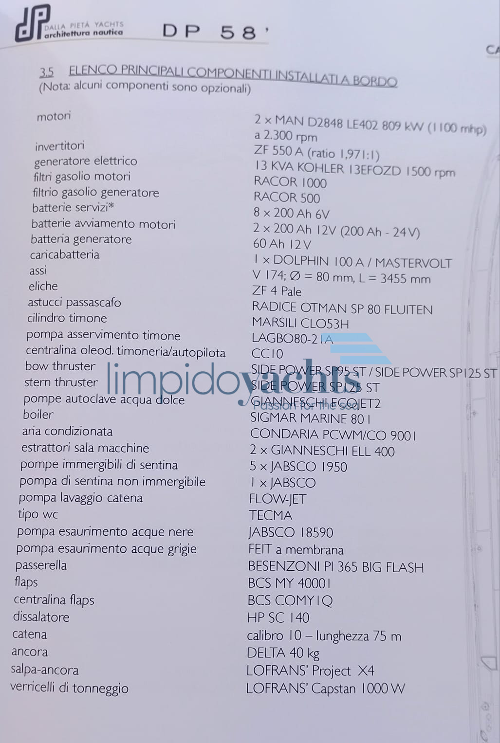 Generatore Kholer 13 kw - Teak completo plancetta e gradini poppa in massello 1 cm (nuovo 2024), teak pozzetto, dissalatore idromar (nuovo 2023), doppia autoclave, frigorifero cucina in cabina nuovo 2023, aria condizionata, passerella idraulica, elica di prua, elica di poppa, boiler, aria condizionata, estrattori sala macchine, wc Tecma, passarella idraulica, flaps, dissalatore HP SC 140, salpancora Lofrans, verricelli di tonneggio.