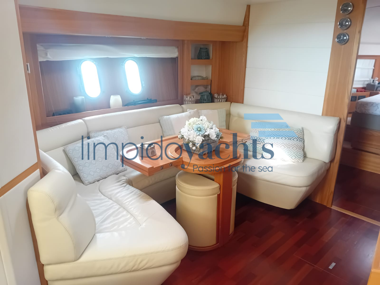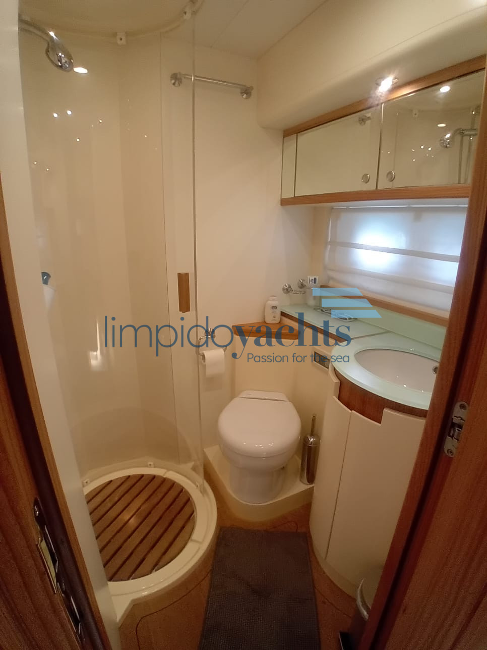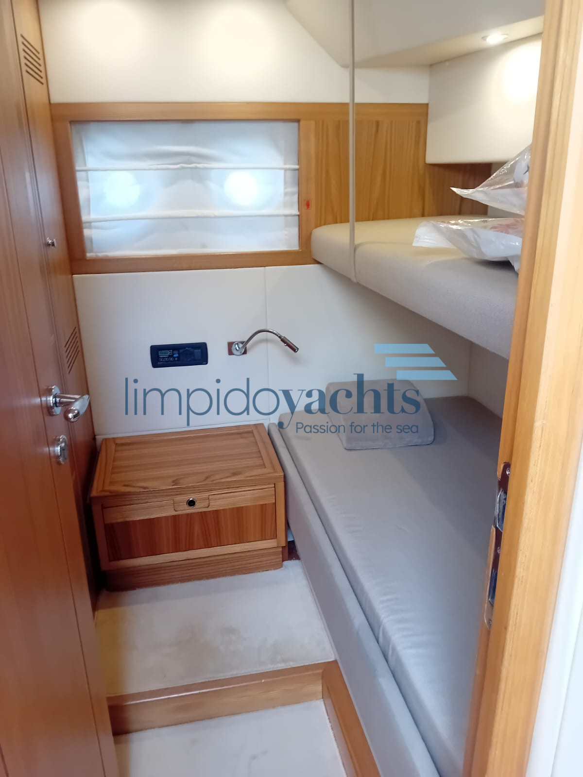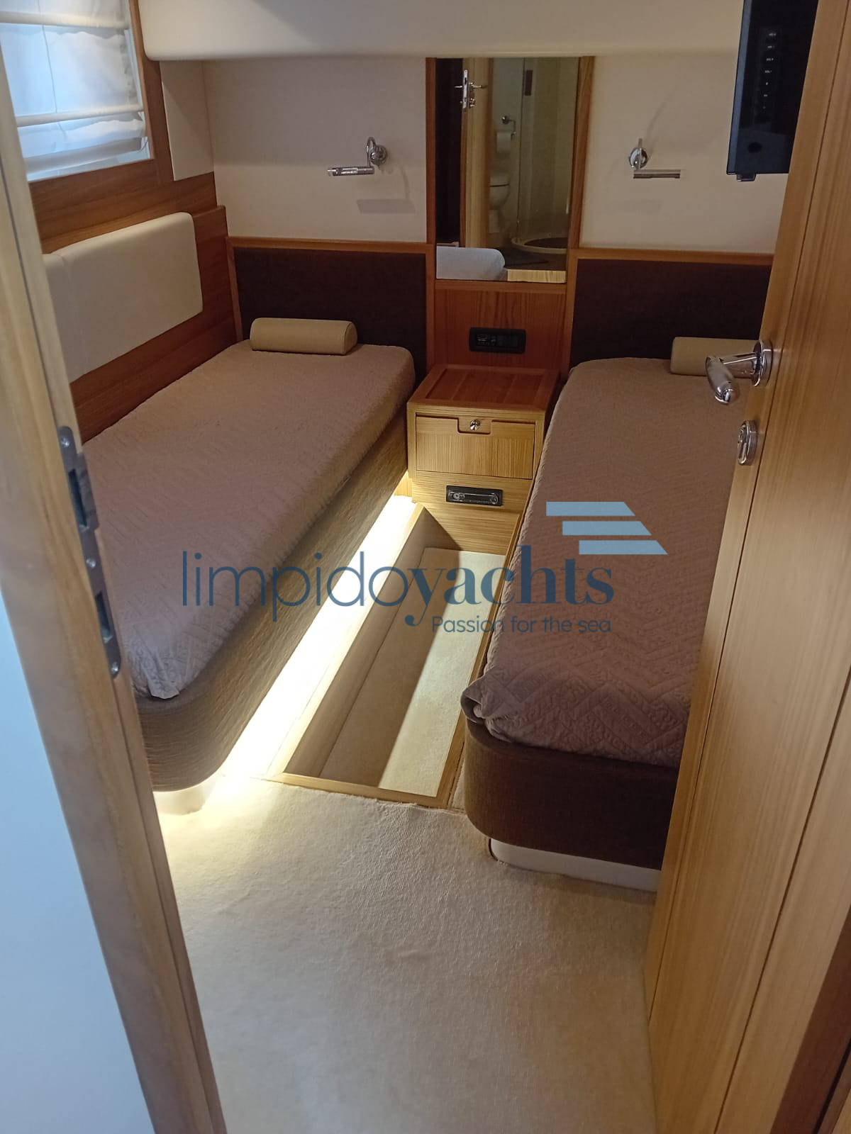 3 cabine doppie + 3 bagni con doccia, quarta cabina (doppia con letti a castello) con accesso indipendente dal pozzetto, ampio bagno con box doccia (utilizzabile sia come cabina marinaio che come quarta cabina ospiti).