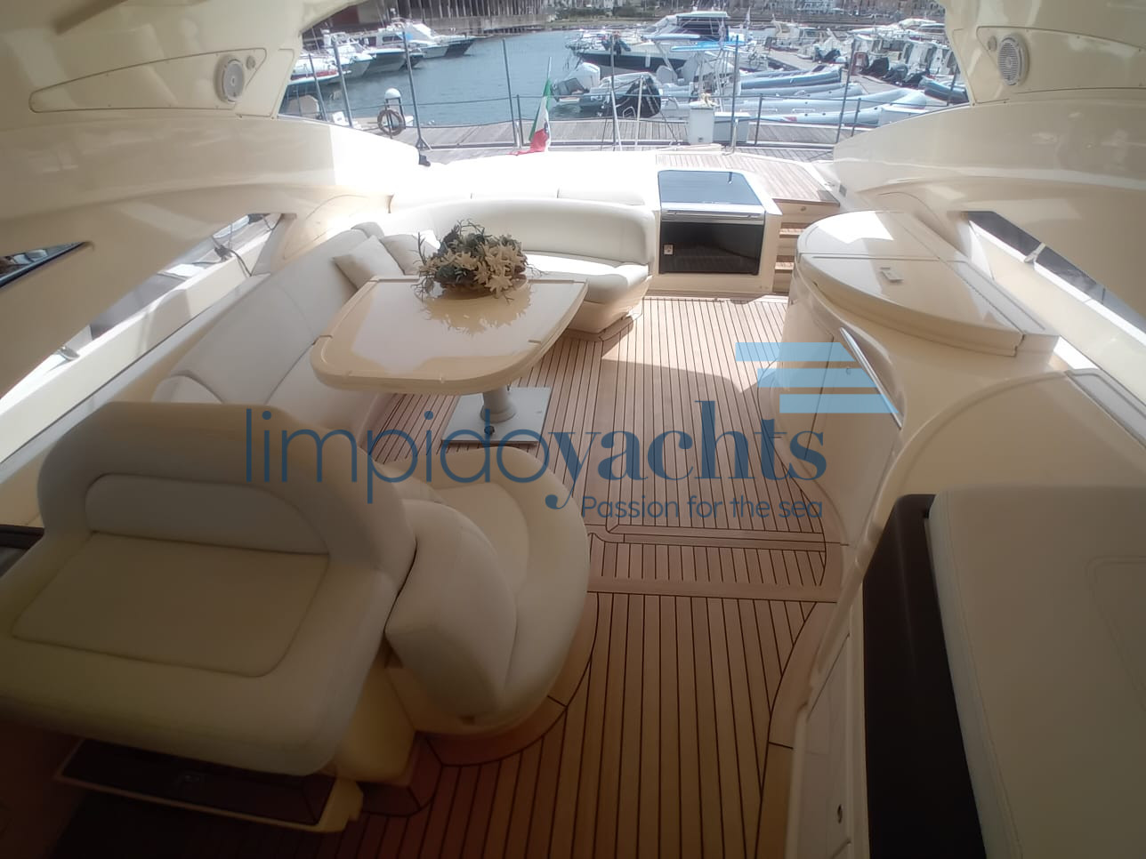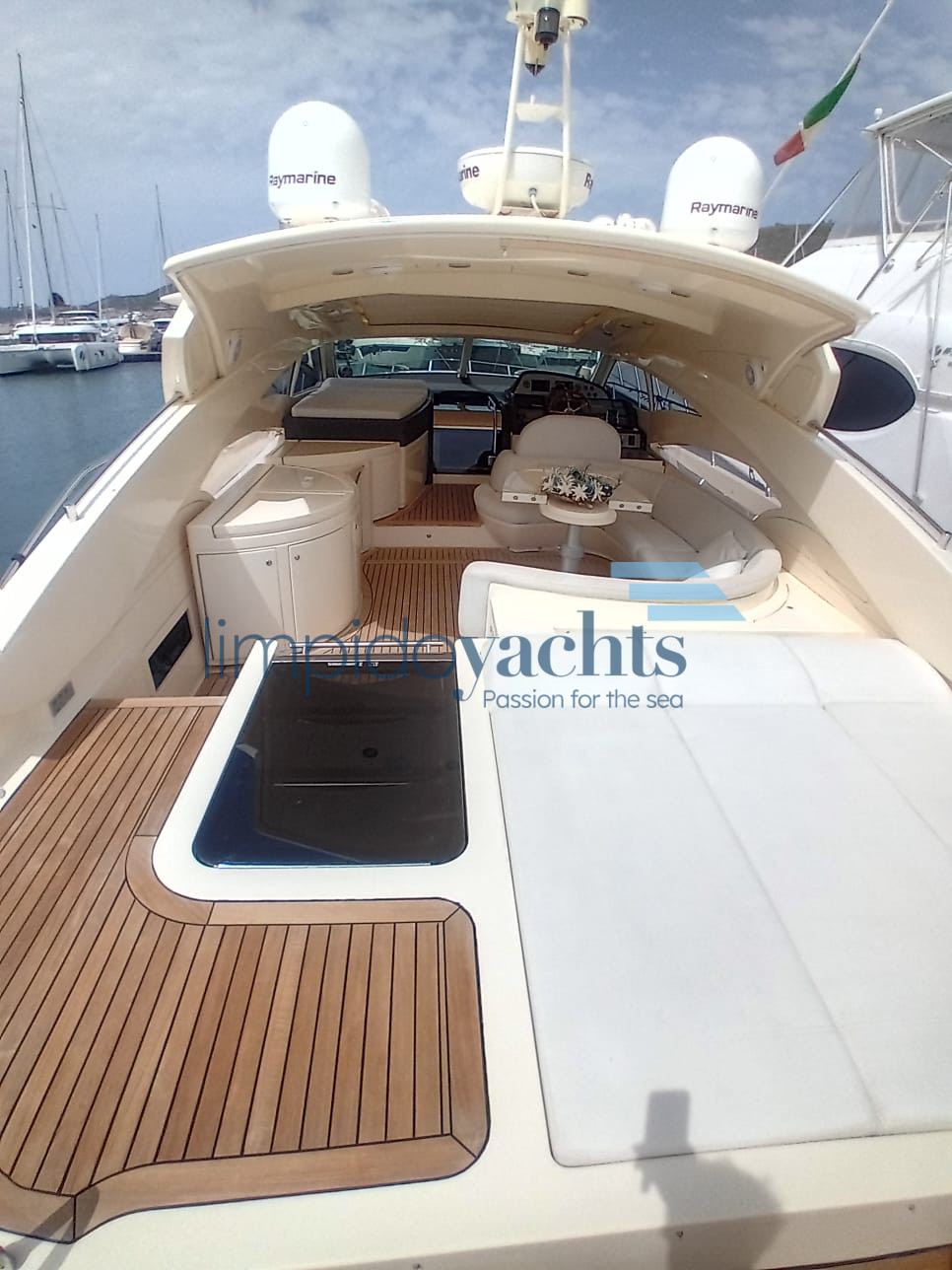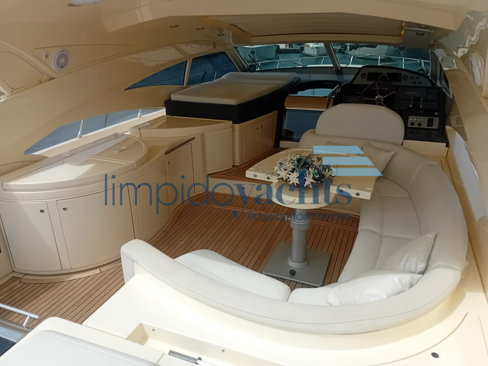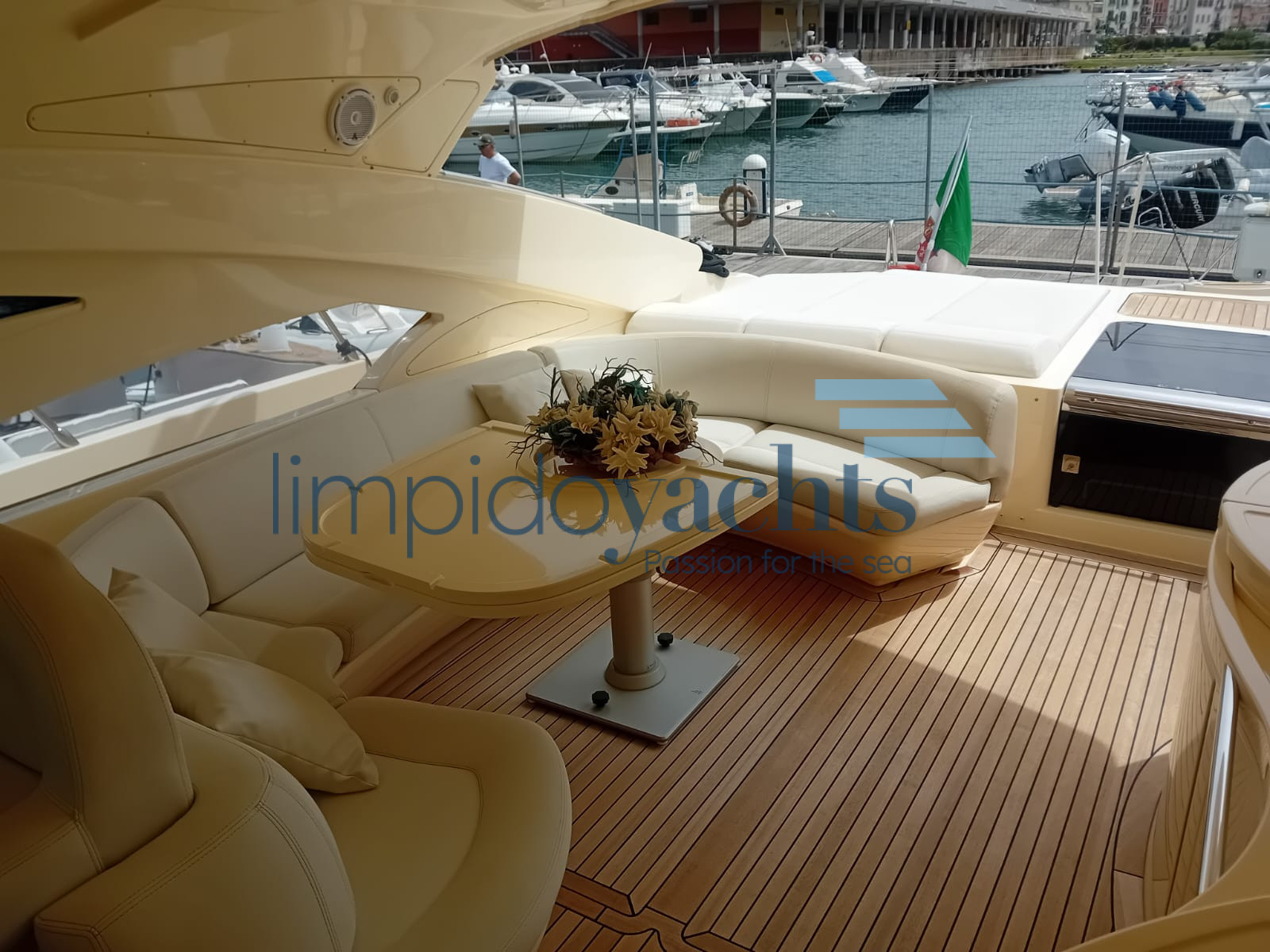 ampio pozzetto con tavolo, mobile cucina esterno attrezzato con piano cottura, lavello, frigorifero ed ice-maker, prendisole a poppa e prua.